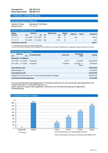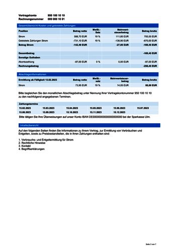 Auf der ersten Seite geben wir Ihnen einen Überblick über die gesamte Rechnung. Hier informieren wir Sie darüber, ob Sie ein Guthaben oder eine Nachzahlung haben. Außerdem teilen wir Ihnen Ihren neuen monatlichen Abschlag für den nächsten Abrechnungszeitraum mit.