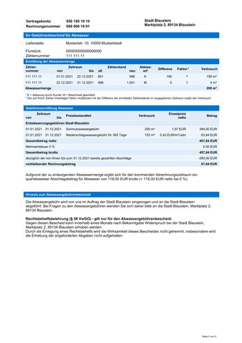 Das Abwasser- und Niederschlagswasserentgelt unterliegt nicht der Mehrwertsteuer. Deshalb erscheint hier ein Mehrwertsteuersatz von 0%.