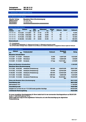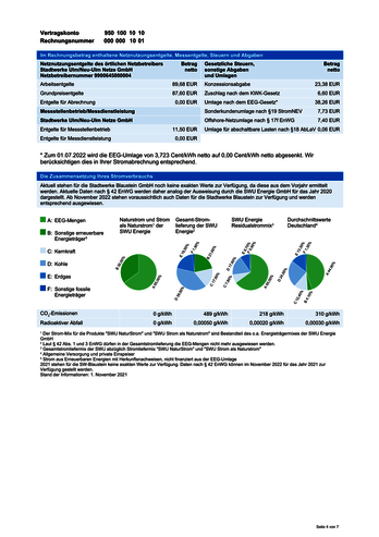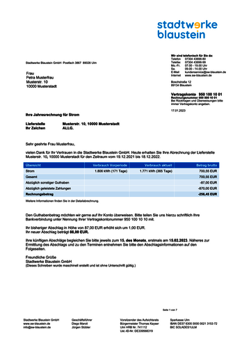 Auf Ihrer Rechnung finden Sie viele nützliche Informationen, die auf Ihr letztes Energiejahr zurückblicken. Damit Sie alle Einzelheiten genau nachvollziehen können, finden Sie hier eine Musterrechnung im Überblick mit vielen hilfreichen Erklärungen.