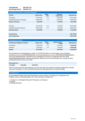 Die Tabelle „Abschlagsinformationen“ gibt Ihnen einen Überblick über die Zusammensetzung Ihrer Abschläge, aufgeschlüsselt nach Sparten (z.B. Strom, Trinkwasser, Abwasser).